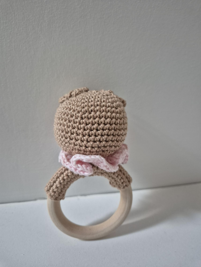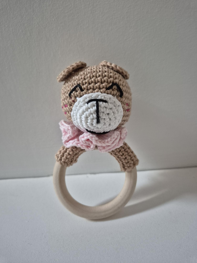 Hochet - Anneau de dentition Ourson col rose avec grelot