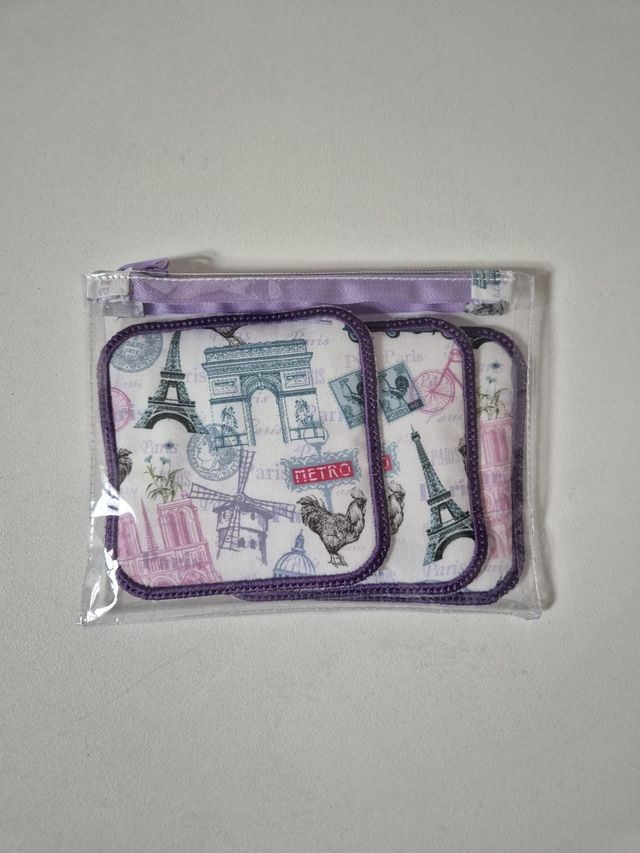 Trousse transparente contenant 3 lingettes motifs monuments parisiens.