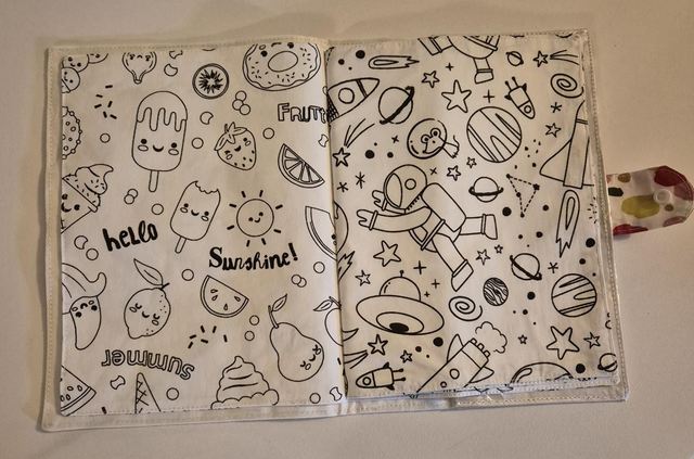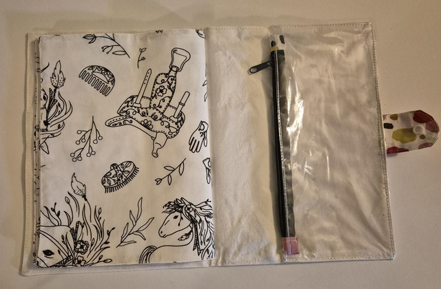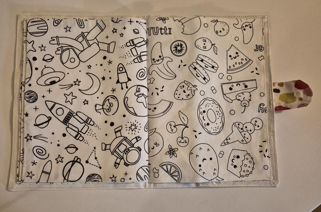 Cahier à colorier avec sa trousse intégrée coordonnée. Il se ferme par un bouton pression blanc en forme d'étoile.