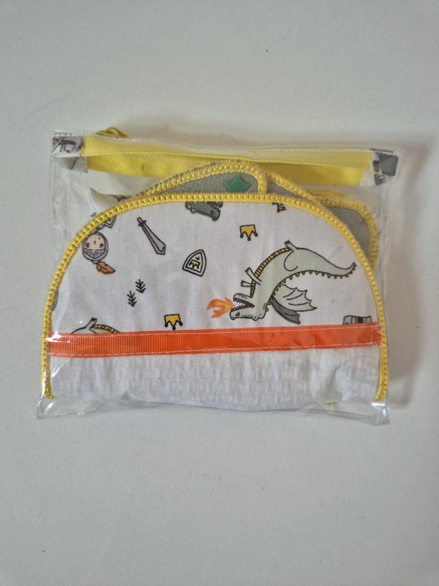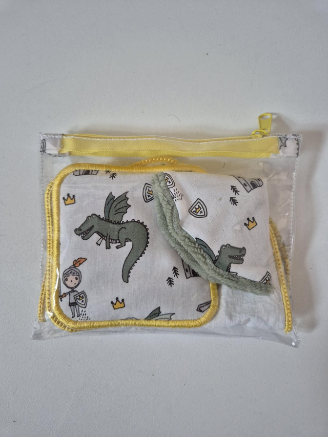 Trousse transparente contenant 1 bavoir + 2 lingettes et 1 pare-pipi motifs Chevaliers.